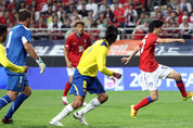태국전사들이 ‘아르헨티나의 맞춤형 상대’ 에콰도르를 완파하고 사상 첫 원정 16강 진출을 향한 힘찬 출발을 보였다. 허정무 감독이 이끄는 한국 축구대표팀은 16일 서울월드컵경기장에서 열린 ‘주식회사 E1 초청 월드컵 축구 국가대표팀 평가전’에서 후반 연속해서 터진 ‘피터팬’ 이승렬과 ‘블루 드래곤’ 이청용의 골을 앞세워 에콰도르를 2-0으로 완파했다. 이로써 한국 대표팀은 지난 3월 영국 런던에서 ‘가상의 나이지리아’ 코트디부아르에 2-0으로 승리한 데 이어 B조 최강 아르헨티나를 대비해 국내에서 열린 마지막 평가전에서도 2-0으로 완승을 거두며 경기후 개최된 출정식에서 환하게 웃었다. 한국은 이날 이동국과 염기훈을 투톱으로 세우고 박지성-기성용-신형민-김재성을 중원에, 김동진-조용형-곽태휘-오범석을 포백으로 기용하고 골키퍼에는 이운재 대신 정성용을 내세웠다. 한국은 전반 초반부터 파상공세를 펼치며 에콰도르의 골문을 노렸다. 중원을 장악한 한국은 전반 4분 기성용의 프리킥 슛을 시작으로 공격의 주도권을 잡아나갔고 김재성의 오른쪽 돌파로 수차례 슈팅 기회