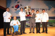 경기도장애인체육회는 지난 1일 오전 경기도 제2청사에서 제29회 전국장애인체육대회 종합우승 4연패 달성 우승기 및 우승배 봉납식을 가졌다. 이날 봉납식에서는 한성섭 도장애인체육회 사무처장이 종합우승기와 우승배를 도체육회장인 김문수 지사에게 전달한 데 이어 종목 우승을 달성한 도장애인육상연맹 홍덕호 전무이사와 도장애인역도연맹 권처문 전무이사, 도장애인댄스스포츠연맹 주영준 회장이 종목 우승배를 봉납했다. 도는 지난 9월 21일부터 25일까지 전남 일원에서 열린 제29회 전국장애인체육대회에서 금메달 122개, 은메달 132개, 동메달 100개를 획득하며 종합점수 18만1천889점으로 역대 장애인체전 사상 최고득점을 기록하며 ‘라이벌’ 서울시(금 106, 은 98, 동 89·종합점수 16만8천929점)을 1만2천960점차로 여유 있게 따돌리고 종합우승 4연패를 차지했다.