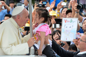 프란치스코 교황은 방한 나흘째인 17일 “아시아의 젊은이들, 여러분은 그리스도에 대한 고귀한 증언, 위대한 증거의 상속자들”이라며 “하느님의 사랑을 믿고, 세상으로 나아가라”고 말했다. ▶관련기사 3면 특히 교황은 이날 일정에서도 세월호 아픔을 함께하는 유가족 세례식을 진행, 세월호 희생자를 방한 내내 어루만졌다. 교황은 이날 충남 서산시 해미읍성에서 열린 제6회 아시아 청년대회 폐막미사 강론에서 “우리는 깨어 있어야 한다. 성덕의 아름다움과 복음의 기쁨에 대한 우리 감각을 무디게 만드는 우리 자신과 다른 사람들의 죄와 유혹, 그러한 압력을 허용하지 말아야 한다”고 밝혔다. 폐막미사에는 청년대회 참석자 6천여 명과 천주교 신자, 시민 등 5만여 명이 참석했다. 그는 “외국인과 가난한 사람, 마음이 부서진 이들을 멀리하고 싶은 유혹이 많을 것”이라며 “곤궁한 이들에게 봉사하는 것이 주님과 더 가까이 사는 데 방해가 되는 것처럼, 도움을 간청하는 사람들을 밀쳐 내서는 안 된다. 도움을 바라는 모든 이들의 간청에 연민과 자비와 사랑으로 응답하시는 그리스도처럼 살아야 한