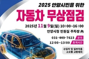 안양시는 오는 9일 시청 민원실 주차장에서 ‘자동차 무상 안전점검’을 실시한다. 경기도자동차전문정비1사업조합 안양시지회가 여는 이번 점검은 오전 10시부터 오후 4시까지 진행된다. 시민들은 사전 예약 없이 차량을 가지고 방문하면 무상으로 안전점검을 받을 수 있다. 주요 점검사항은 와이퍼 등 소모품 교체와 오일류 보추으 내부 연막 소독 등이다. 단, 수입차나 일부 차종의 경우 소모품 교체가 제한될 수 있다. 자세한 사항은 경기도자동차전문정비1사업조합 안양시지회로 문의하면 된다. [ 경기신문 = 송경식 기자 ]