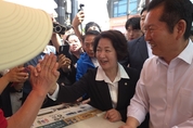 6·3 지방선거 더불어민주당 추미애 경기도지사 후보가 19일 정청래 당대표, 김병욱 성남시장 후보 등과 함께 성남 모란시장에 방문해 당원 집결과 민심 공략에 나섰다. 이날 현장에는 정청래 당대표와 김병욱 성남시장 후보, 김승원 민주당 경기도당위원장, 김태년(성남수정)·이수진(성남중원)·박해철(안산병)·한민수(서울강북을) 의원, 안민석·유은혜 경기도교육감 예비후보, 김용 전 민주연구원 부원장 등이 자리해 추 후보의 행보에 힘을 실었다. 이들은 모란시장을 찾은 시민들과 접촉하며 ‘이재명 정부 성공’을 위한 지방선거 필승 의지를 다졌고, 몰려든 인파에 안전사고를 우려해 일정을 단축할 정도로 인산인해를 이뤘다. 후보와 당 지도부가 한자리에 모여 당원 결집과 민심 공략에 나서면서 본격적인 지원사격에 돌입한 모습이다. 추 후보와 정 대표, 김 후보가 시장 입구에 들어서자 상인들은 손을 흔들며 환대했고, 시민들은 스마트폰을 들어 현장을 담기에 여념이 없었다. 이들은 시장 곳곳을 누비며 현장의 온기를 직접 체감했다. 약 1시간 동안 시장 일대에서 상인들의 손을 맞잡으며 고충을 청취했다. 또한 사탕·과일·땅콩·젓갈 등 식료품을 직접 구매하며 시민들과 격의 없이 어울렸다. 특