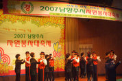 “소외 계층 없는 모두가 행복한 사회를 만들려는 남양주시의 의지와 자원봉사자 여러분들의 열정으로 올 한해에는 소외계층에게 희망을 심어주는 자원봉사활동 원년의 초석을 다졌다고 생각합니다.” 이석우 남양주시장은 지난 8일 시청 다산홀에서 열린 ‘2007 남양주시자원봉사 대축제’ 행사에 참석, 올 한해 지역사회 곳곳에서 봉사활동을 펼쳐온 자원봉사자들을 위로하면 이같이 말했다. 자원봉사자들을 격려하고 이들에게 보람과 긍지를 심어주기 위해 개최된 자원봉사 대축제에는 이석우 시장을 비롯, 김영수 남양주시의회 의장과 시의원, 최재성 국회의원과 박기춘 국회의원 그리고 자원봉사자 등 500여명이 참석했다. 행사는 1부와 2부로 나눠 진행됐으며, 1부 식전행사에서는 시청 직원들로 구성된 NRB 보컬의 흥겨운 연주와 남양주예총 회원들의 축하공연, 남양주노인복지회관과 동부노인복지회관 회원들의 수화공연 및 스포츠댄스 등이 공연되면서 참석자들을 즐겁게 했다. 2부 행사에서는 올 한해 지역사회에서 남다른 봉사활동으로 타의 귀감이 된 삼육구호봉사회 등 13개 단체와 29명의 자원봉사자들에게 상장이 수여됐으며 470여명에게는 마일리지 인증서가 지