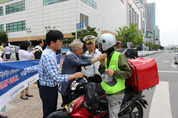 안전보건공단 경기지사는 27일 배달음식점 밀집지역인 수원시청 인근에서 업무협약 체결기관인 수원남부경찰서와 유관기관인 ㈔한국산업간호협회, 경기남부보건안전센터, 용인면허시험장과 함께 ‘안전한 배달문화 정착을 위한 이륜차 재해예방 캠페인’을 실시했다고 밝혔다. 이들 기관들은 이날 서비스업에서 가장 많은 사망사고가 발생하는 이륜차 배달종사자를 대상으로 안전모 착용을 계도하고, 직접 안전모를 씌워주는 행사를 전개했다. 또 이륜차 안전배달 가이드 책자와 소형 이륜차 관련 처벌기준 및 범칙금 OPL(One Point Lesson), 홍보 물품을 제공했다. 송재준 공단 경기지사장은 “이륜차 재해예방을 위해서는 안전모를 반드시 착용하고, 신호위반·인도주행 등을 금지하며, 제동장치 등 정기적인 안전점검이 필요하다”며 “빨리빨리가 아닌 안전한 배달문화 정착이 무엇보다 중요하다”고 말했다. /김장선기자 kjs76@