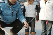 9일 수원시 권선구 세류동 수원천 '사랑의 썰매장'에 나온 아이들과 아버지가 팽이치기를 하며 즐거운 시간을 보내고 있다.
