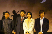 강제규 감독의 초대형 프로젝트 「태극기 휘날리며」(제작 강제규 필름)가 5일 오후 2시 서울 신라호텔에서 제작발표회를 갖고 제작 사실을 공식적으로 발표했다. 사진 왼쪽부터 강제규 감독, 장동건, 이은주, 원빈.