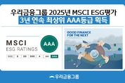 우리금융그룹이 꾸준한 ESG 경영을 통해 신뢰받는 금융그룹으로 나아가고 있다. 16일 우리금융그룹은 글로벌 투자정보 제공기관 세계적 투자정보 기관인 MSCI(모건스탠리캐피털인터내셔널)가 실시한 2025년 ESG 평가에서 3년 연속 최상위 등급(AAA)을 받았다고 밝혔다. MSCI ESG 평가는 전 세계 8500개 이상 상장기업을 대상으로 기업의 ESG(환경·사회·지배구조) 리스크 관리 역량을 평가하는 글로벌 표준 지표다. AAA부터 CCC까지 7단계로 나눠, ‘AAA’는 업계 최고 수준의 리스크 관리 능력을 갖춘 기업에 부여된다. 우리금융그룹은 ▲기업 지배구조 ▲데이터 정보보호 ▲환경 영향 항목에서 ‘Leader(선도그룹)’ 등급을 받았다. 특히 이사회 내 ‘윤리·내부통제위원회’ 신설을 통해 감독 기능을 강화하고, 윤리경영 체계를 고도화한 점이 높은 평가를 받았다. 환경 분야에서는 친환경 금융 지원 확대 성과가 주목받았다. 2024년 약 2700억 원 규모의 녹색채권을 발행해 친환경 프로젝트 자금을 조달했으며, 한국수자원공사와 전력구매계약(PPA)을 체결해 재생에너지 기반을 강화했다. 임종룡 우리금융그룹 회장은 “그룹 전체가 일관된 철학 아래 ESG 경영을…
